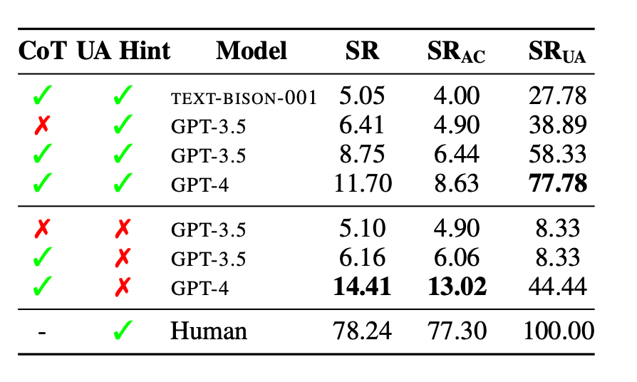 The models stopping much earlier concluding that a task is unachievable way to soon. Example : GPT-4 flagged 54.9% of feasible tasks as impossible. Sometimes, this "UA" intent picked up from the instruction itself. To mitigate this, the researchers had to tweak the prompt into a step function (Chain of Thought approach) or recommend "stop if stuck" (UA Hint). With this suggested approach, by (Removing UA hint), the success rate (SR) of GPT -4 increased from 11.70% to 14.41% and despite an overall decline in identifying unachievable tasks, GPT-4 retains the capacity to recognise 44.44% of such tasks. It does so by generating reasons of non-achievability, even without explicit instructions.