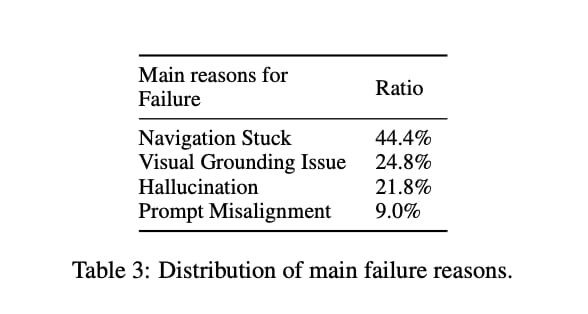 Navigation Stuck : The most commonly observed error when the LLM runs out of step before the task is complete. This happens when the agent's search query is not precise and end up pulling more search results and deciding to browse the wrong results. When the scrolling area is too small in a website section, the agent might issue continuous scrolling orders and get stuck. Sometimes the agent is confused mid-way through a page on deciding wether to scroll up or down.