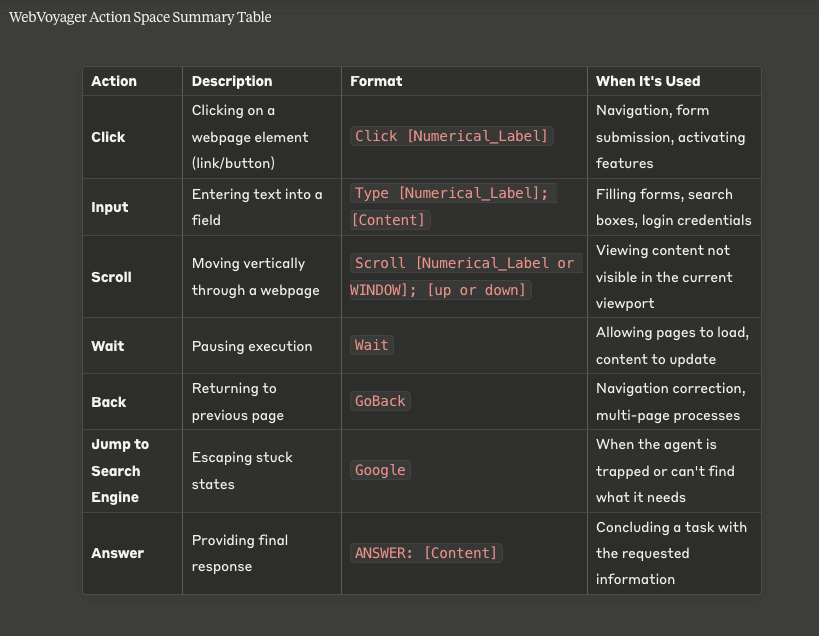 The Action space : The different Actions available for the Agent in WebVoyager are shown below, these are the possible interactions that the Agent can perform in each of the 15 websites it is tested upon.