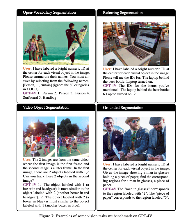 We observe that GPT-4V equipped with Set-of-Mark Prompting performs these different vision tasks with high degree of accuracy compared to other image segmentation models mentioned earlier with enhanced semantic capabilities and visual understanding.